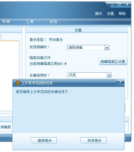 下班前用瑞星进行全盘杀毒,现在的硬盘用瑞星杀,一般都需要10来个小时!计划杀毒完成后自动关机,可是每天都看到瑞星卡在杀毒1个多小时处弹出1个对话框,其大意是上次在这里中断了,是否继续?(本页面下面的回复中有截图)