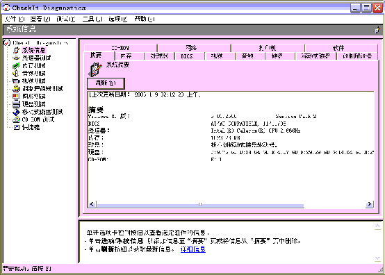 这是一个用来检测硬件的软件,小试一下,检测相当全面,连MODEM的测试都有,用来测试硬件是否有问题还是很管用的。