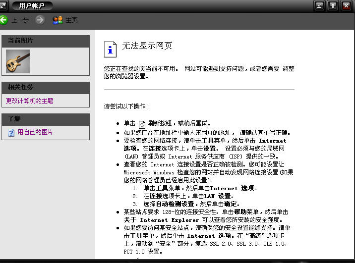 我的用户帐户图片突然不能更改了,只能用默认的那些图,如果想点击“浏览图片”改成自己喜欢的图,就会出现“当前网页不可用~~”,真是莫名其妙~~~问题不大,但是让人很不爽啊~~~~紧急求助啊~!!!!