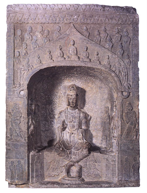 造像为高浮雕。佛结跏趺坐于束腰须弥座上,双手置于腹前,作禅定静思状。佛高肉髻,面目清瘦,上身着通肩式袈裟,衣褶垂于座下,身后有莲瓣形背光。