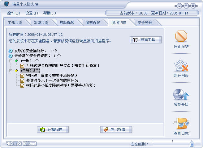 瑞星2006最大的特色就是防火墙可以扫描系统对不安全设置提出安全建议,更可贵的是可以自动下载系统补丁。这对系统安全是非常有帮助的,但是唯一的问题就是这些东西用户都是看不见的