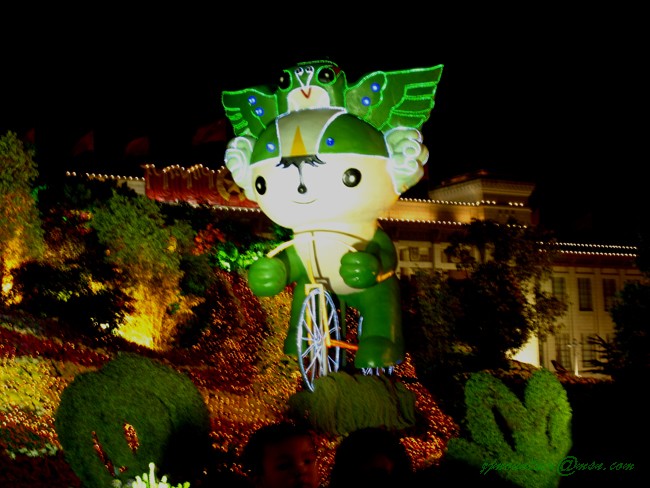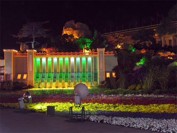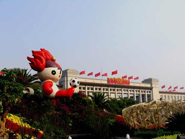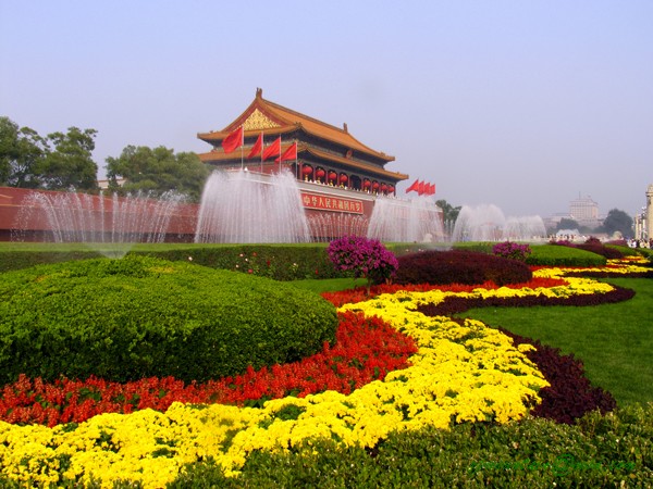 天安门广场批上了节日的盛装:广场中央为鲜花、音乐喷泉、庆祝标语、国父画像;东侧为奥运主题的微缩景观,主要有五个福娃和鸟巢;西侧为不达拉宫和三峡大坝的微缩景观。
