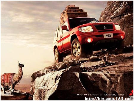 三菱汽车打入阿拉伯地区的广告。在崎岖的山路和多水的阿拉伯地带。人们都是用骆驼和大象来作为最好的交通工具,而现在,有了三菱越野车,那些连骆驼和大象都望而却步的地方,都可以轻松上路了!
