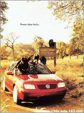 大众汽车宣传电动门锁的广告,场景设在野生动物园,向尽情的和动物们一同玩耍,又想避免危险,电动门锁就派上用场了,就算猩猩们怎么折腾都不可能跑进车来了。