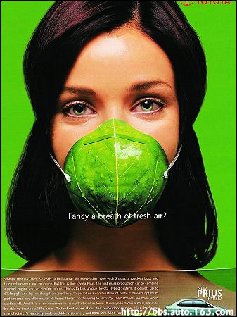 丰田新款Prius环保车广告,广告语:“前面那辆是丰田车。”看见上面的图,似乎可以呼吸道新鲜的树叶氧气口罩下清醒的空气。