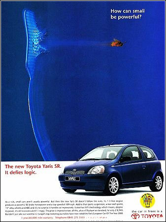 丰田Yaris小车广告。广告语为:“小物体怎么才能有大能量?”图中用一只蜜蜂冲破苍蝇拍来形象的说明,小物体在高速运动的时候可以产生巨大的能量。从而比喻Yaris小车身形虽小,但能量无穷。