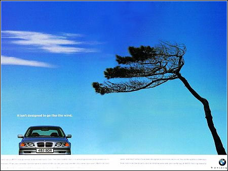简单的画面中,很容易看出一阵大风吹来,树和云都在动,而宝马车却在整个画面中显得非常平稳。广告语是:“它并不是被设计成随风而动的。”显示出该车稳健的气质。
