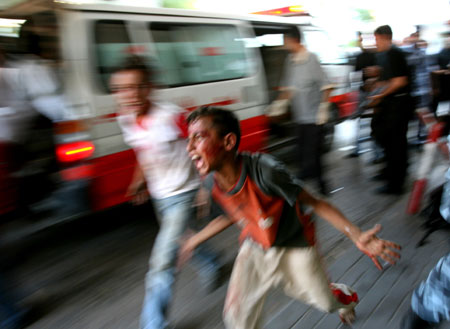 2006年7月10日,以军空袭加沙城,一名受伤的巴勒斯坦男孩尖叫着奔跑。