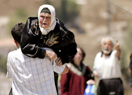 2006年7月31日,一名黎巴嫩老人被强行带离饱受战火摧残的村庄。