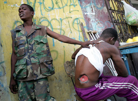 2006年2月2日,一位海地居民展示他身上的枪伤。