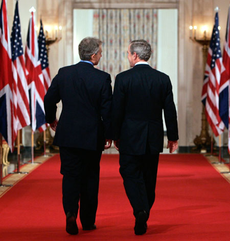 2006年5月25日,美国总统布什和英国首相布莱尔就伊拉克问题举行联合新闻发布会后,一起离开白宫东厅。
