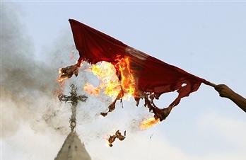 2006年2月6日,巴勒斯坦人在西岸城市的一个教堂前焚烧丹麦国旗抗议讽刺先知漫画现象。