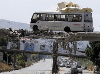 2006年8月15日,黎巴嫩公车在以黎战争中通过一条破损的桥转移人员。