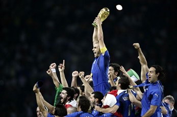 2006年7月9日,意大利队队长法比奥·卡纳瓦罗在赢得德国世界杯冠军后高举大力神杯。