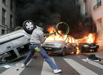 2006年5月23日,法国学生示威,一名男子向燃烧的汽车扔垃圾袋。