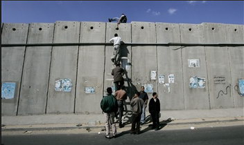 2006年10月20日,巴勒斯坦人在利用梯子翻越富有争议的以色列隔离墙。