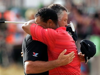 2006年4月23日,美国高尔夫球选手泰戈-伍兹在英国皇家利物浦高尔夫俱乐部庆祝胜利。