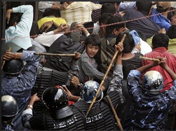 2006年4月22日,尼泊尔防暴警察驱打示威民众。