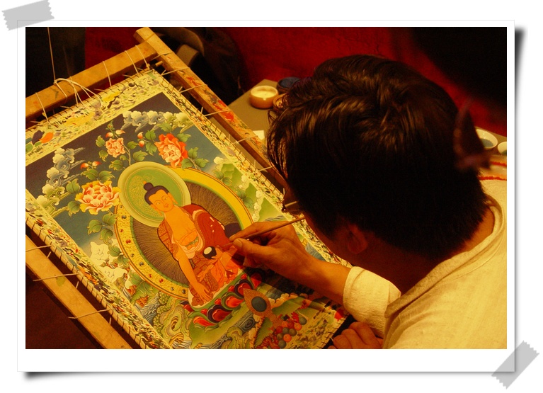 “唐卡”是藏语。“唐”的含意与空间有关,表示广袤无边。画师茨旦朗杰举例说,就像在一块布上,既可画几百甚至上千尊佛,也可只画一尊佛。“卡”有点像魔术,指的是空白被填补。说白了,唐卡,其实也就是西藏的卷轴绘画。