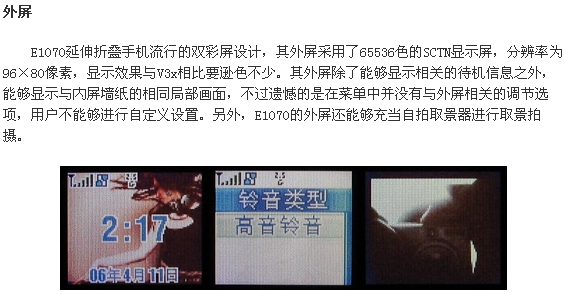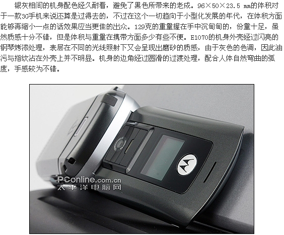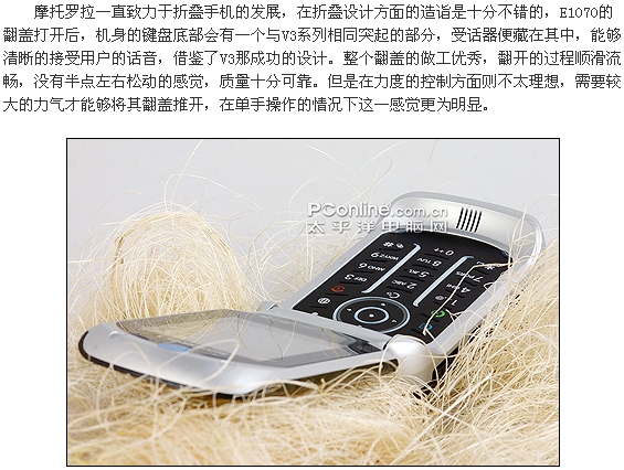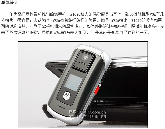 E系列在摩托罗拉的产品线中基本全是清一色的直板机型,像E365、E398、E680i和E1000等等热卖机型,都是以强大的多媒体影音娱乐功能为卖点,而E1070成为了摩托罗拉首度推出的E系列中的折叠机型。既然冠予了E字母开头,E1070自然身手不凡。就在E1070全球开卖之际,我们率先获得了E1070的简体中文版本,第一时间为大家送上其火热新鲜的测试报告。
