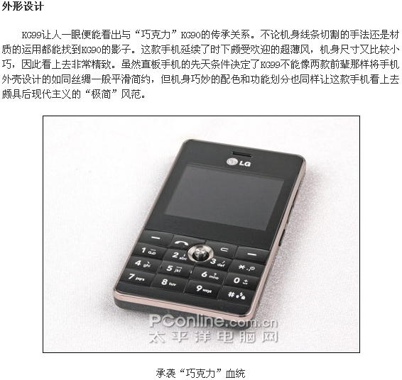 作为一款经典手机的后续之作,KG99的上市并没有像前辈KG90那样轰轰烈烈。不过由于拥有“巧克力”这块金字招牌,KG99依然引起了广大消费者和业界的注意。作为“巧克力”系列的第三款手机,KG99此次采用了直板造型(第一款“巧克力”KG90采用了滑盖造型,第二款“巧克力”KG98采用了折叠造型)。由于KG99的出现,巧克力手机的外型设计便涵盖了除旋转外全部的手机外型类别。而这也为让人不仅思索,以后LG会不会继续推出一款以KG××命名的旋转造型的巧克力手机呢?