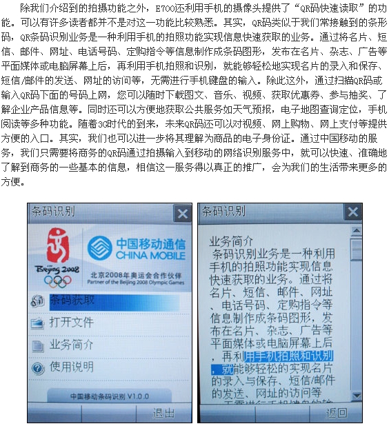 但是今天我们要介绍的中兴E700却是面向GSM市场的产品,而且作为移动定制机型推出。中国移动所选定的定制机型都有严格的规定,国产的智能手机入选也并不多见,从中我们可以看出移动对中兴E700的认同。更重要的是E700还负担起中国移动“QR码识别”和“手机地图”这两个新应用服务的推广。E700是否有能力完成这一使命,也许能从下面的评测文章中找到答案。