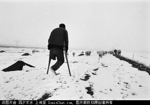 25.拄着双拐的残疾老汉赶着羊群徐行在雪地里