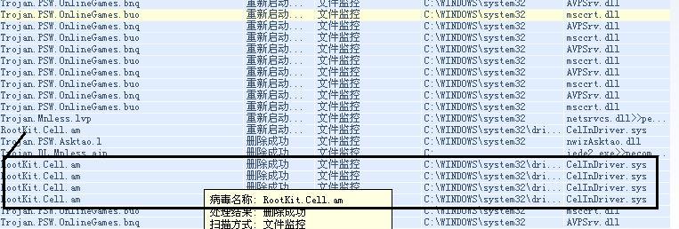 每次重启,瑞星也不报病毒,但在瑞星病毒隔离中总会显示有两个CelIndriver.sys 是病毒文件Rootkit.Cell.am 提示删除成功 时间为重起时间