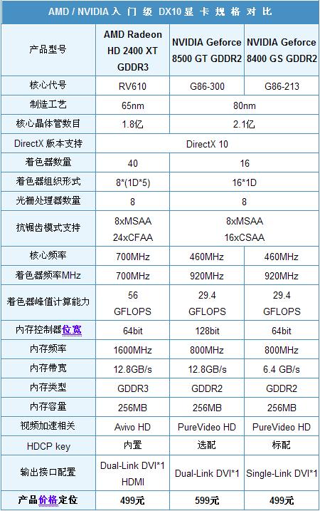 Radeon 2400 XT和Geforce 8400 GS同样处于入门级DirectX 10显卡定位,两者相似之处颇多,包括相同的499元人民币指导价格、精简的着色器规模及64bit位宽的本地内存配置等。实事求是的说,这类仅提供3D支持特效但并不保证执行速度的产品并不适合以3D游戏为主要应用的玩家选购,但作为最新一代独立显卡,它们在3D API支持级别和高清视频加速能力上有所突破,拥有自身独特的价值体现。
