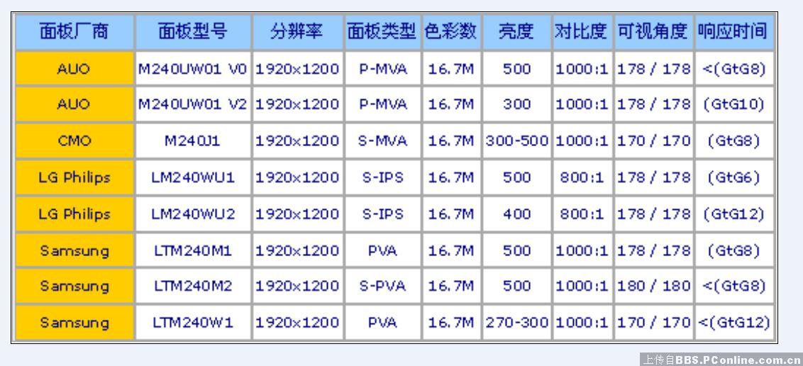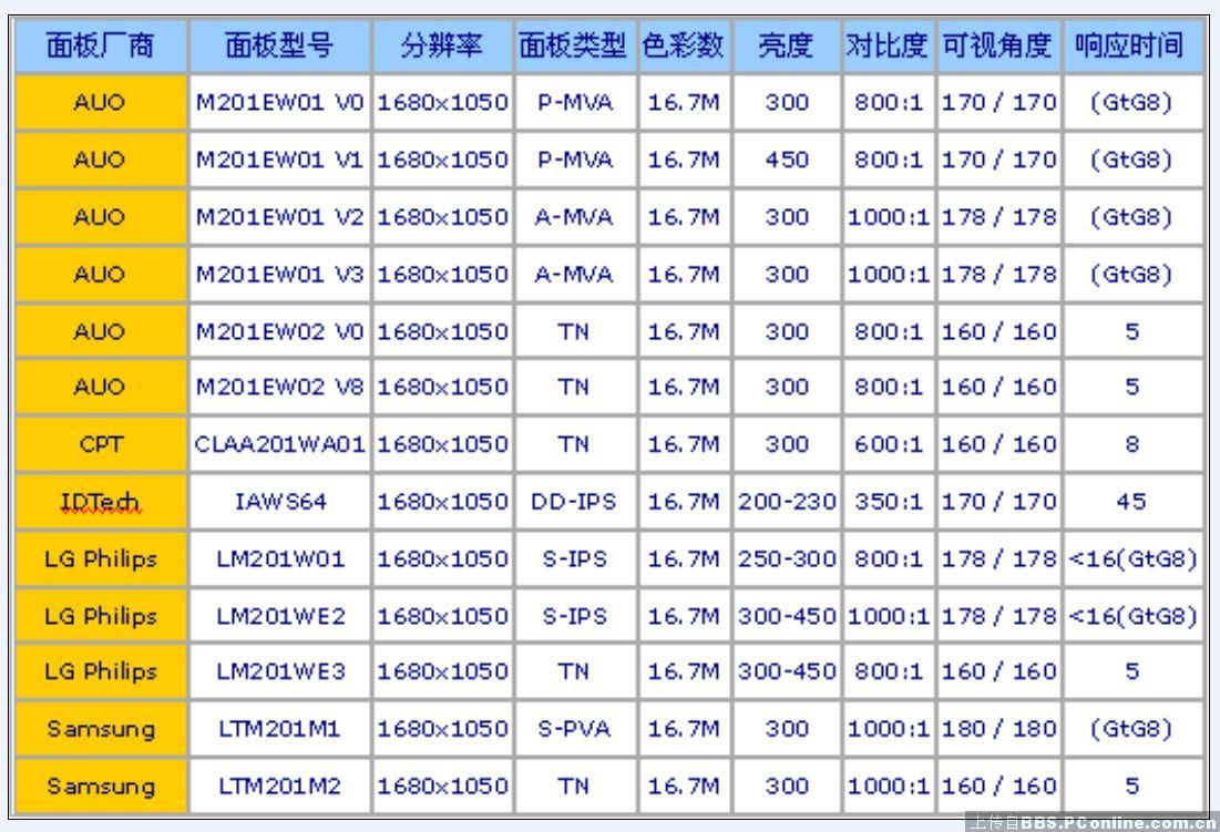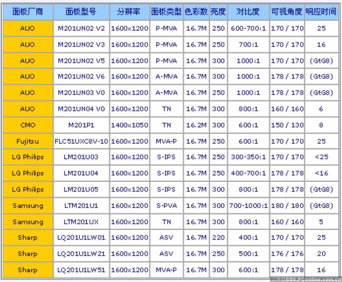 下面是各个屏产品常用的液晶面板,转给大家看看,参考一下