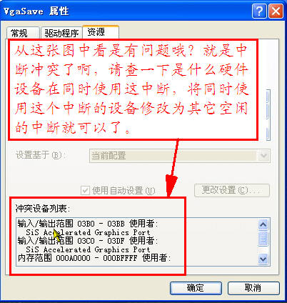 从三楼的图片中看,是硬件中断有冲突啊?请查找是什么设备在同时与显卡使用一个中断量并且修改它为其它空闲的一个中断量就可以了。