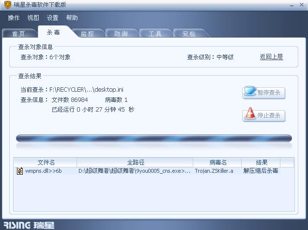 事情经过:好几天前我又重新下载了nero7升级文件,文件存放在我的硬盘F盘上,因为好几天没有杀过毒了,前天运行瑞星2008全盘杀毒,结果还是从nero7升级文件里杀出了两个病毒,一个说已经删除成功,另一个要我处理。我做了不处理的动作。杀完毒后我没有把这文件删除,仍旧存放在原来位置。今天我又运行了瑞星2008全盘杀毒(已经升级到最新版),结果又在nero7升级文件中杀毒了同样的病毒,一个说删除成功,另一个要让我处理。同样的文件被杀了两次,两次都说清除成功?我真不知道,瑞星到底是处理了这个病毒还是骗骗我们用户说杀除了,如果不是我忘了把那个给瑞星杀出病毒的nero7升级文件删除还不会发现这个问题。现在我很担心,这个瑞星每次报的杀除病毒是真杀除了还是没有杀除呢?