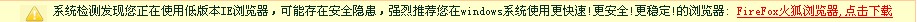 几乎开每个网页的时候都显示 系统检测你使用的底版本IE浏览器 可能存在安全隐患 强烈推荐你使用火狐浏览器