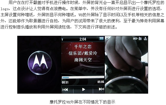 摩托罗拉V8时尚超薄翻盖外观在发布之处已经引人许多网友的兴趣,而且这款配备了内外双QVGA屏幕的V8还配备了惊人的420MB的内存。V8被誉为是摩托罗拉的翻身之作,对它寄予厚望,而这款拳头产品除了漂亮的外观以及高端的参数之外,各方面的实际表现如何了,下面我们PConline评测室将会一一为大家解答。