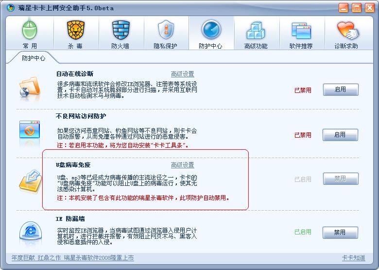 截图里有说啊,您的机器如果安装了杀毒软件,因为杀毒软件里已经包含u盘免疫的功能了,所以卡卡的就被禁用了,这是正常的啊!