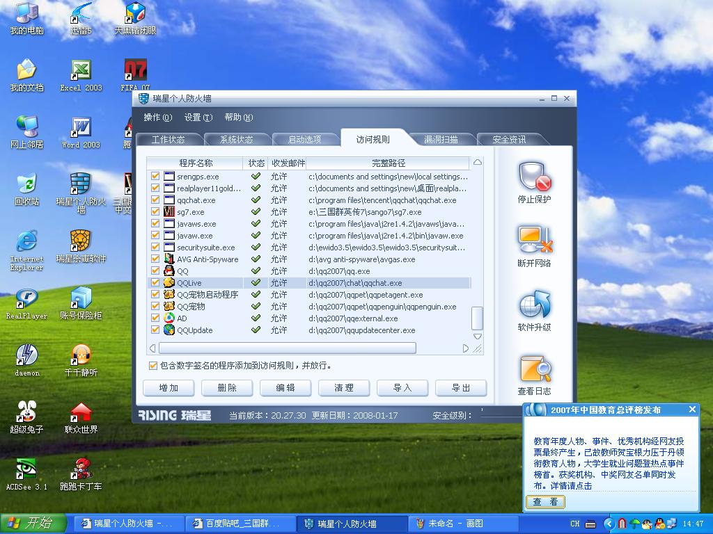 经过我的测试 当打开瑞星的防火墙的时候 QQ聊天室是无法正常打开的 右边总是显示空白 当我关掉瑞星防火墙以后 QQ聊天室立刻恢复正常 补充打开防火墙同时163体育频道也无法正常浏览 无法显示网页 请问这是规则包的问题还是防火墙的问题 忘解答谢谢。 ...