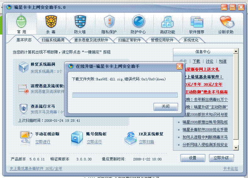 首页 » 个人产品讨论区 » 瑞星其他产品 » 瑞星安全助手 » 卡卡上网安全助手 » 卡卡5.0无法更新