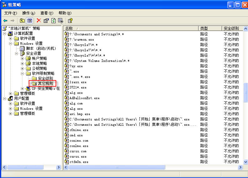 | 【baohe的贴子】【回复“洪之梦”的帖子】 汗! 我还以为多大的事呢! 若你的系统是XP专业版,请在“组策略”的“软件限制策略”里废掉那个“三只眼”。既然知道被人安装了,应该知道其主程序名称与位置。具体设置参考下图(右栏中的DD都是我为预防已知病毒添加的内容)。 如果不知道那劳什子的主程序名及其位置,也好办:用SRENG扫份完整日志贴上来,我帮你找。 ……………… |