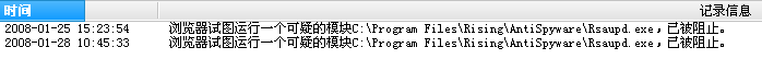 我有两次登陆网站时,金山清理专家防木马程序提示有害程序在后台运行。登陆的这两个网站一个和讯网,一个是金融街。这两个网站都是有名的大网站。但我在登陆百度及中金在线时没有这个提示。查看了日志时才知是瑞星目录下的一个程序。我想起是在启用了卡卡工具条才有的这个提示。就禁了,再登陆和讯网及金融街,金山没有再提示了。不知是不是卡卡被人下了木马,请看下面载图: