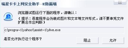 楼主不要担心,这个并不是针对雅虎助手的,这是卡卡ie防漏墙的功能,所有被ie执行的程序都会被拦截,如果是确认是安全的程序的话,直接点“允许”就可以了。