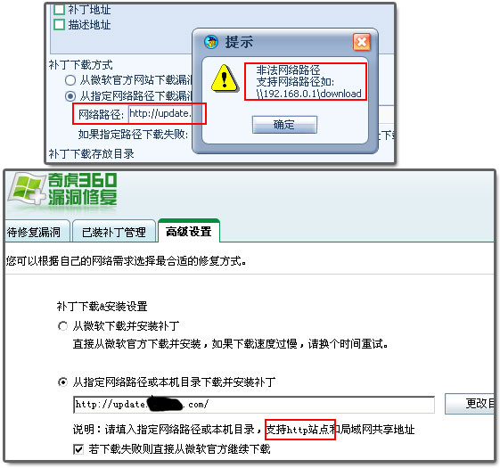 360现在漏洞扫描的升级路径支持http站点了,这样,我同事们的笔记本在家里或单位(即外网或内网)都可以随时访问单位的服务器,以获得补丁文件。
