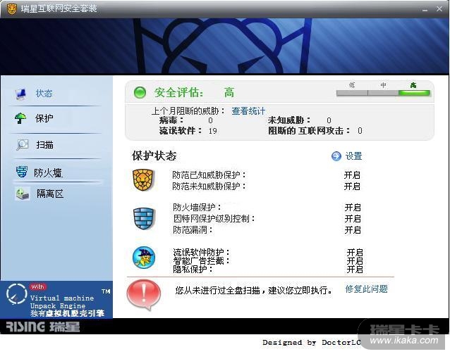 有卡巴有的所有功能~以后我就不用卡巴了~~用用瑞星~~毕竟咔吧的KEY比较难弄~~瑞星的比较容易就搞到~