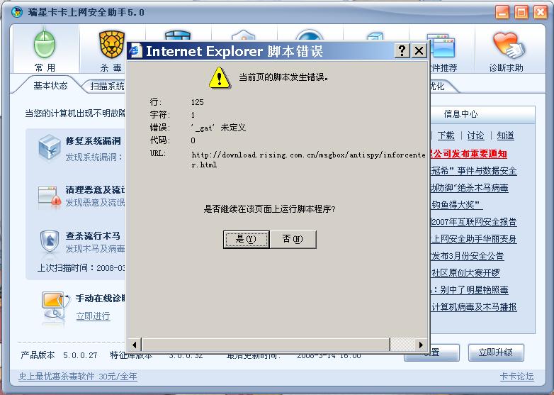 我的卡卡的高级功能无法使用,只要一点高级功能,程序就死掉,而且一打开卡卡就弹出当前页脚本发生错误的提示框,点击的功能不一样显示的错误行就不一样,有时候是125行,有时候是190行,如图示