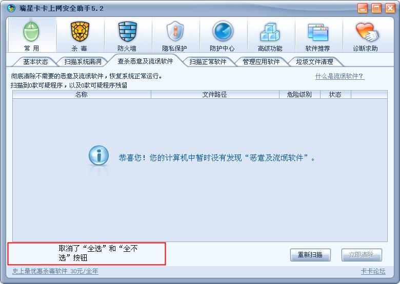 2.恶意及流氓软件 取消了“全选”和“全不选”的按钮