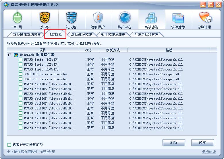 6.增加了“lsp修复”,把以前的winscok修复单独提出来。还增加了“隐藏不需要修复的项”。