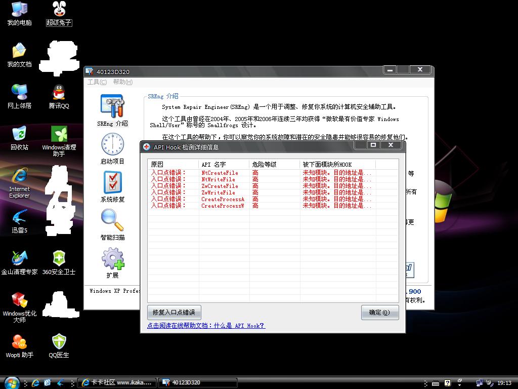 不仅更改了注册表,API Hook也更改了 而且锁死了 真强!我用了N种软件都没有修复成功!佩服佩服!