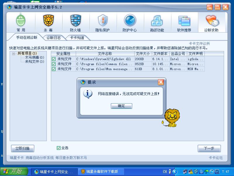 机器基本正常,只稍感有恙?今日扫描报瑞星却出如下错?网络有错为何我上别的和来此都正常呢?特来此求助.