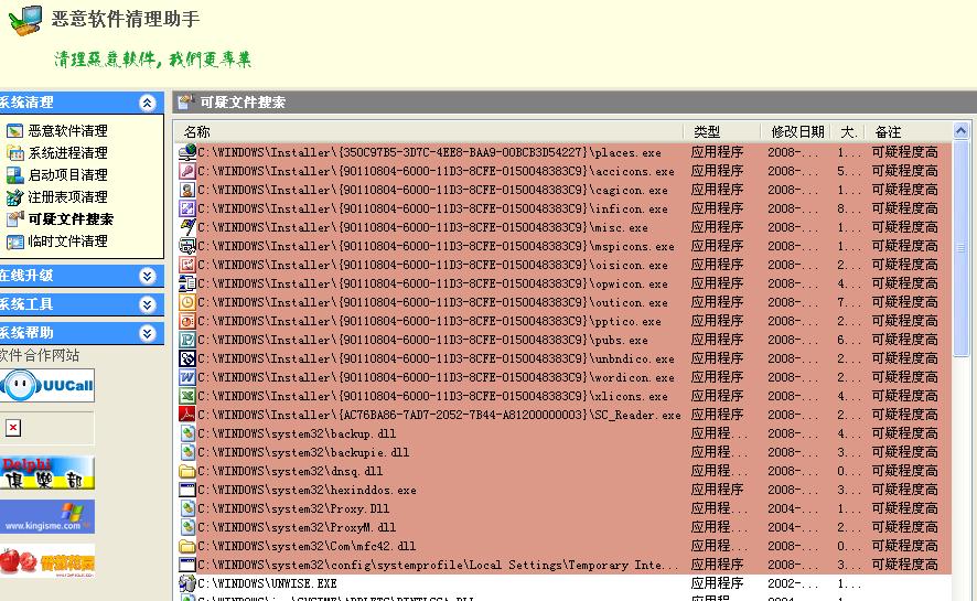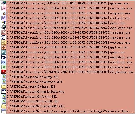 这是我用恶意软件清理助手扫描的结果,其中最后一个的全称是“C:\WINDOWS\system32\config\systemprofile\Local Settings\Temporary Internet Files\Content.IE5\KWEAGVHR\hexinddos[1].exe