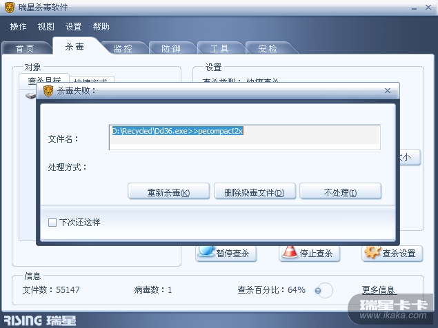 这个是 变种病毒 先用瑞星卡卡5 2 0 15的的助手扫描 删除 然后用瑞星杀毒 删除文件就OK了