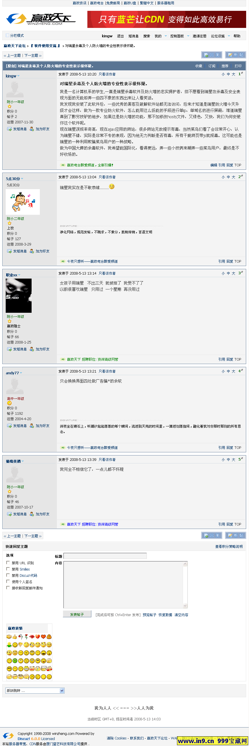 我发现我安装了此软件后,一些优秀的黑客及破解软件站都无法访问,后来才知道是瑞星防火墙今天升级才会这样,做为一款专业防火软件,怎么能用这么低能的手段进行单ip,单域名的进行屏蔽,难道瑞星真到了黔穷技驴的地步,如果这是防火墙的功能,那不如修改hosts文件,又